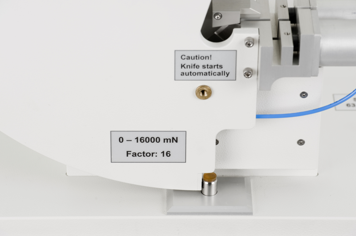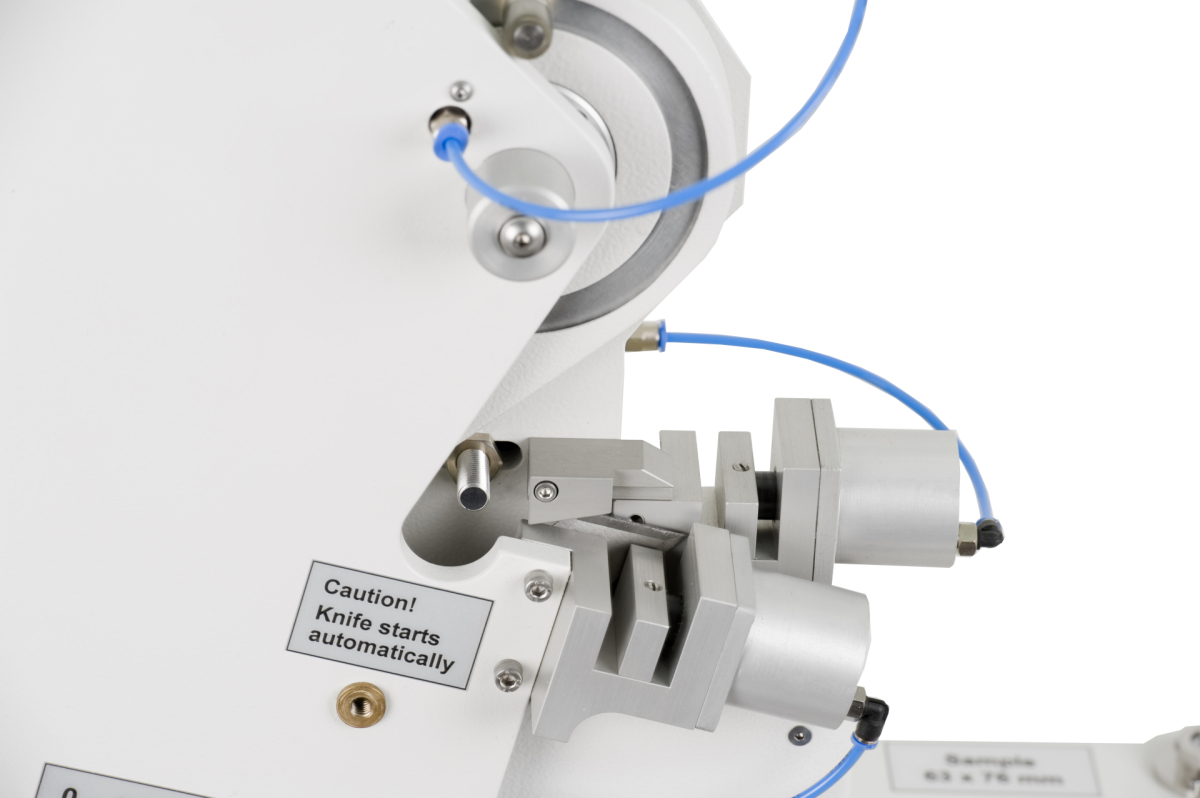 Up to 16 samples (acc. to standard 4 samples), prepared with a sample punch, are placed on top of another and inserted into the sample holder. On the touch screen, the number of samples inserted is selected, these are allocated to a test series (MD/CD) and the start button is pressed. The samples are automatically clamped and cut with a blade. Then the pendulum is automatically initiated and tears the sample above the cut. The pendulum is slowed, returned automatically to the start position, and the destroyed samples are released. The force required to tear the sample is displayed on the touch screen. If more than one run is carried out in MD and CD, these can be compared as statistics, and the results displayed.