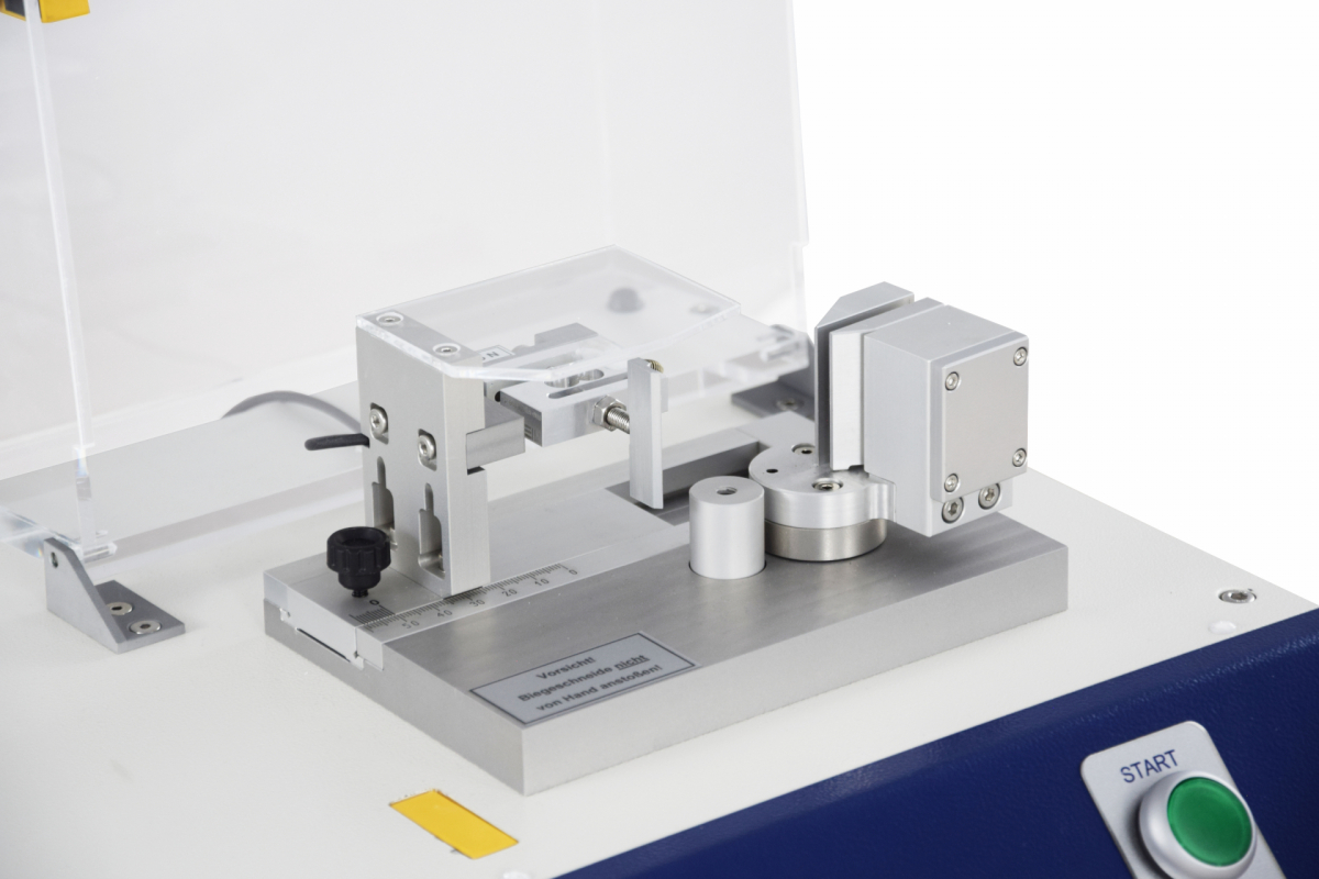 After preparing the sample with the punch, put it into the support. Close the acrylic glass cover, select your test program and assign your test to a test series. When you press the start button, the machine pushes the sample towards the measurement cell with precisely defined speed. When the pre-defined bending angle is reached, the sample remains in this angle for the pre-set dwell time. When the pre-set dwell time is over, the sample returns to the initial position. The touchscreen displays the testing results of up to three pre-defined measurement points. The results are displayed in values as well as in the form of a real-time diagram. If various tests of a test series were done, the results can be compared statistically, and the ratios can be displayed.