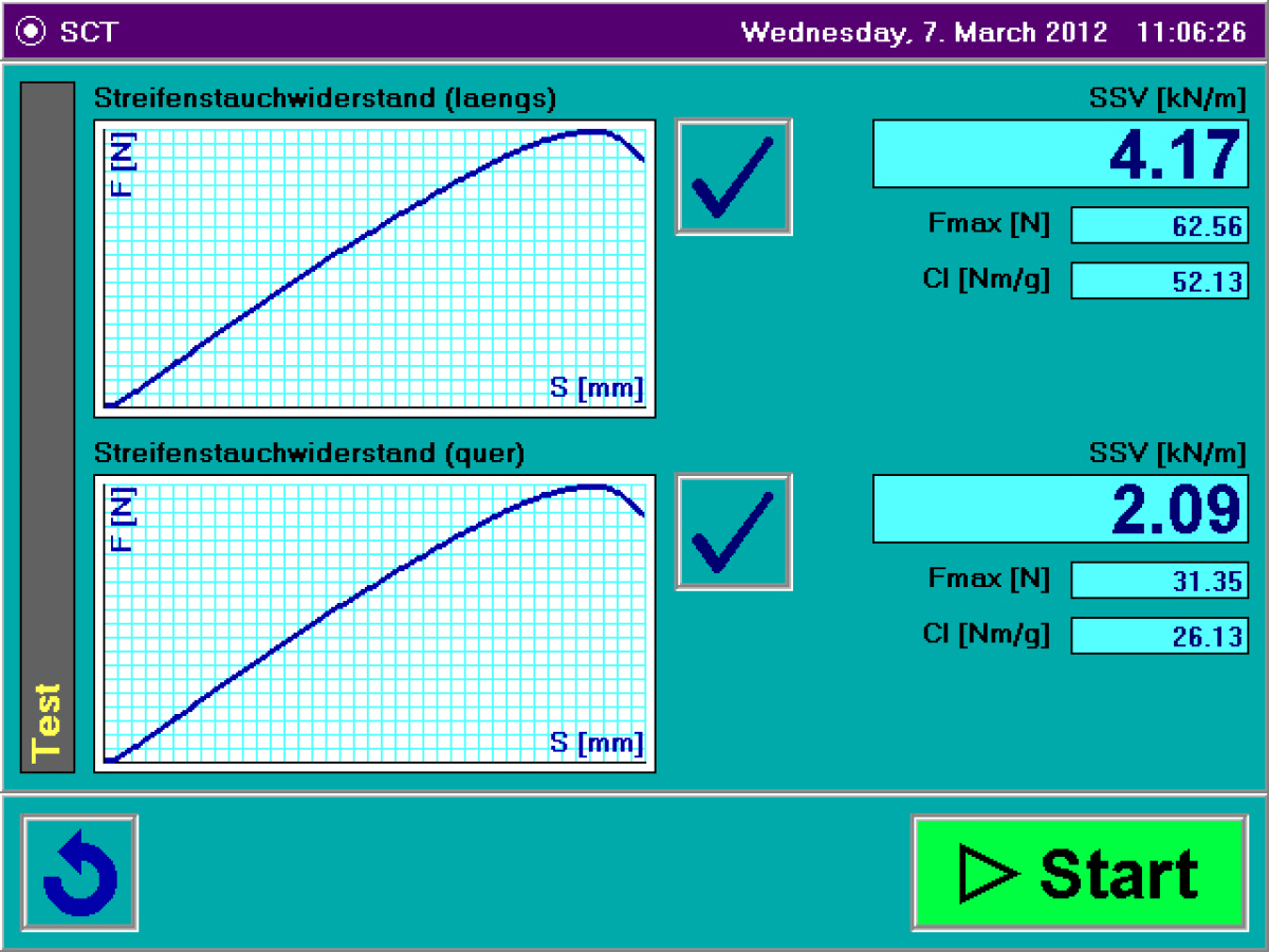 The sample to be tested is placed in the measurement area. It is created in the appropriate format by a pneumatic punch, moved to the lower part of the device automatically by a transport mechanism and placed in the fully-fledged short span compressive test device integrated there. The SCT test starts automatically. On obtaining the test results, the sample is automatically thrown into a refuse container. The measurements can be carried out in MD or CD as required.